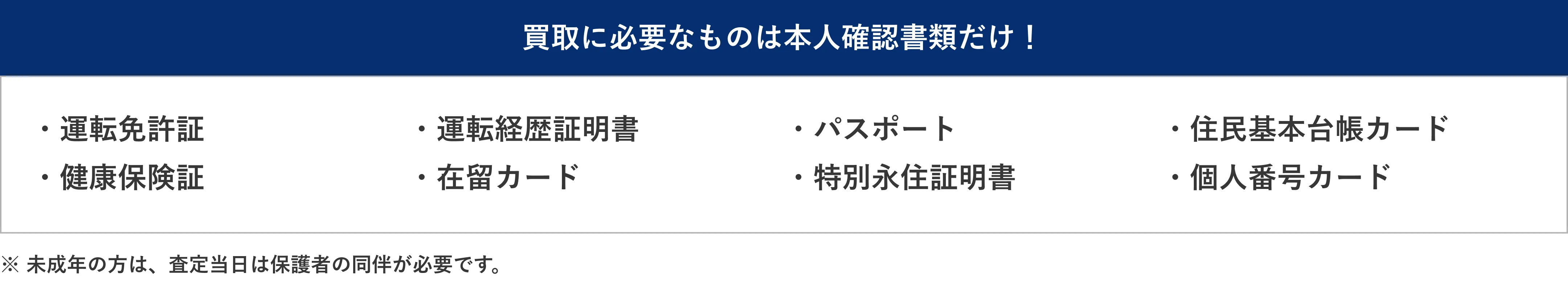 古物営業法に従い、運転免許証や保険証等の本人確認書類が必要です。